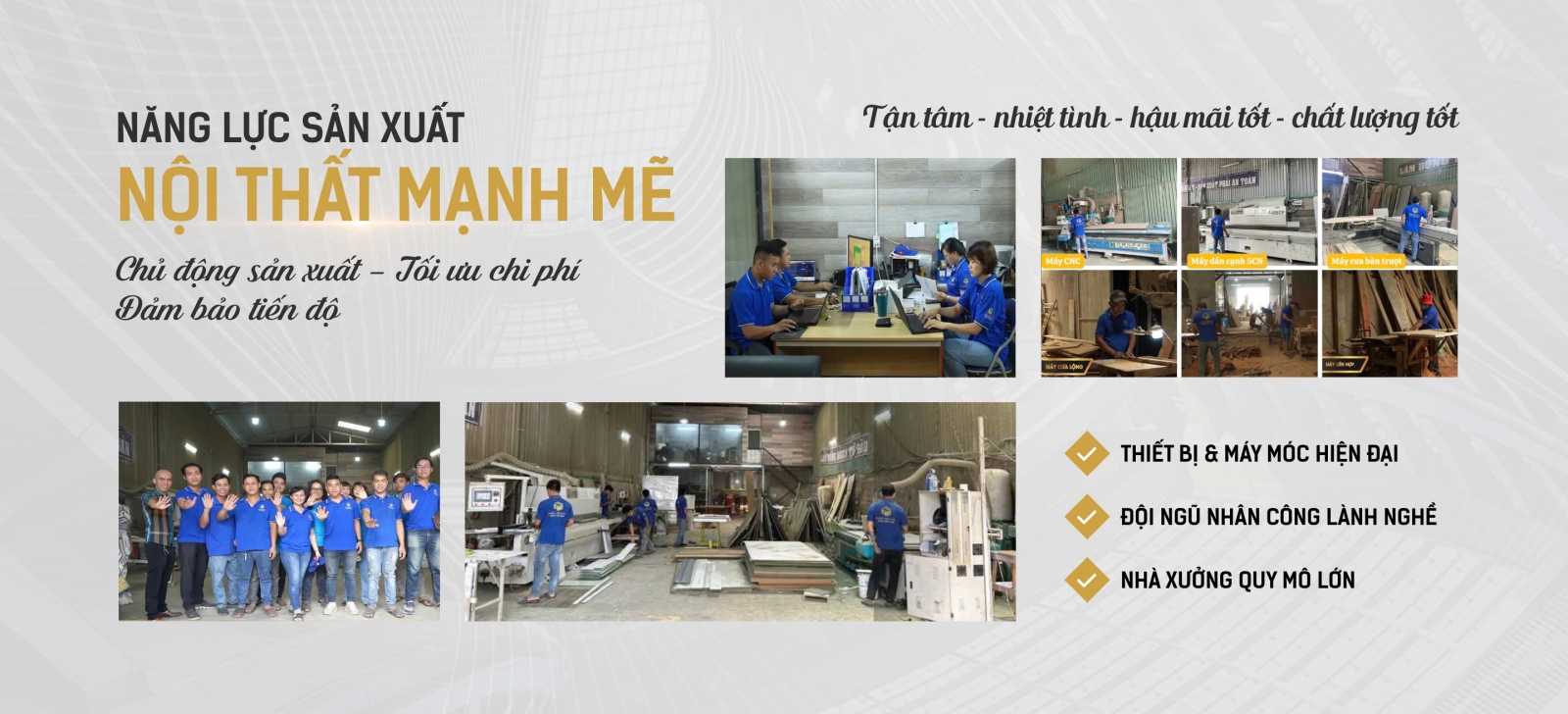 Sở hữu xưởng sản xuất nội thất riêng, chúng tôi đảm bảo quy trình khép kín từ ý tưởng đến thi công, mang đến sản phẩm đẹp – bền – tối ưu chi phí. AE Decor cam kết đề cao chất lượng, tính thẩm mỹ và trải nghiệm khách hàng trong từng công trình.