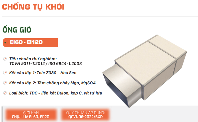Ống dẫn lửa cách nhiệt (EI) là một sản phẩm đặc biệt đáp ứng các tiêu chuẩn rất cao. đặc biệt, đ ể được chấp nhận là ứng dụng bảo vệ chống cháy chính thức, nhà sản xuất phải sở hữu giấy phép do cơ quan chính phủ liên quan cấp. Ống gió EI TDH Đồng Nai là sản phẩm đáp ứng yêu cầu trên. Sản phẩm của chúng tôi đáp ứng các yêu cầu của QC06/BXD, QC03/BCA và quy chuẩn kỹ thuật về thiết vị PCCC Hiện Hành