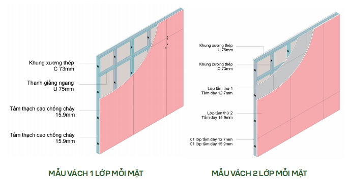 - 2 mặt bọc 2 lớp thạch cao chóng cháy dày 15.9mm